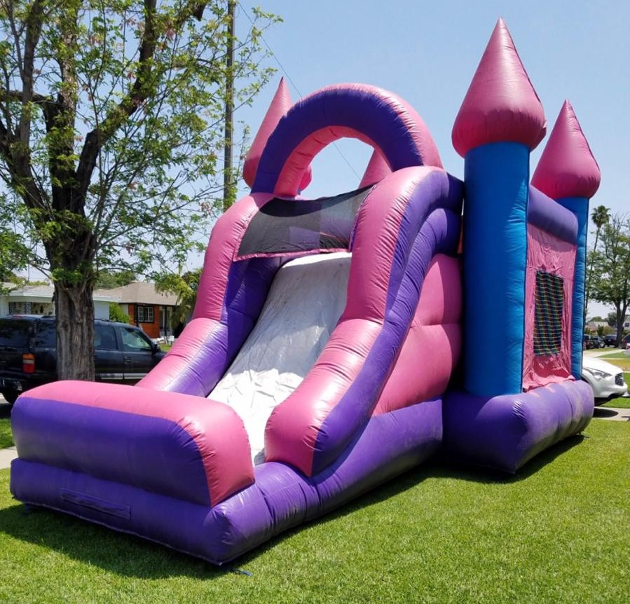 It consists of a very big slide (almost 20’ high) and a very big jumper. Kids can jump, climb, slide and it comes with a basketball hoop in it.