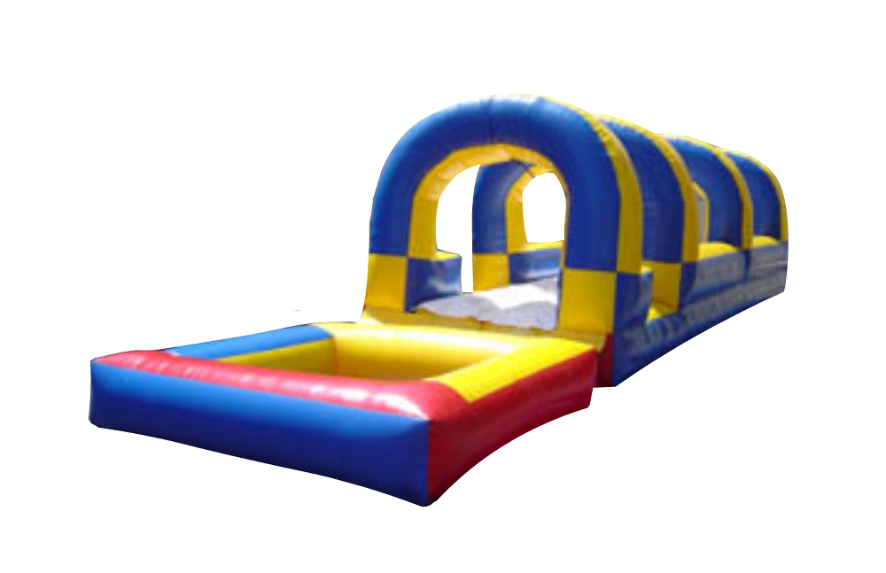 This is our Slip and Slide jumper. Kids run as fast as they can and jump in the inflatable platform. They’ll slide all the way to the pool at the end. It’s great for sunny days.