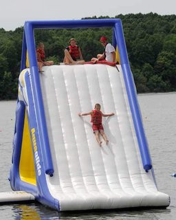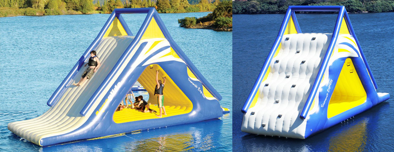 Is the ultimate water playground. Suitable for all ages. You can jump, rock, race, slide, and splash. The fun never ends with this huge set. Easy set up. Take it to the lake or on your boat. 15’H x 22’L x 11’W.
